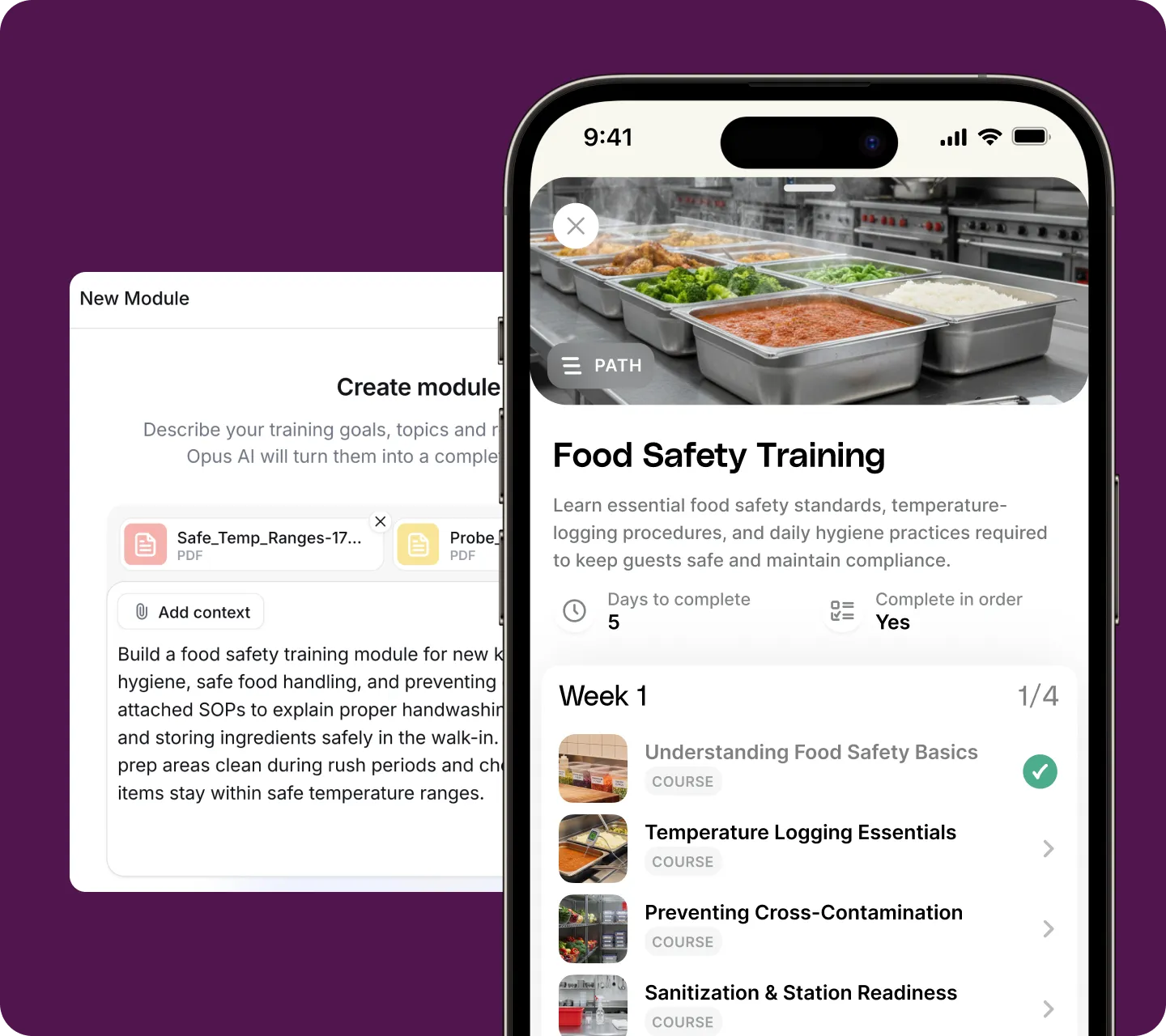 Confident, consistent service starts with training that sticks. Opus helps restaurant teams onboard fast, reinforce standards, and verify skills on the floor.