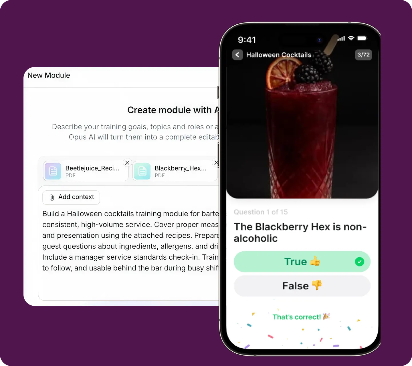 Opus helps training move at the speed of change: build mobile training in minutes, automatically push to the right teams, and track behavior change on the floor.