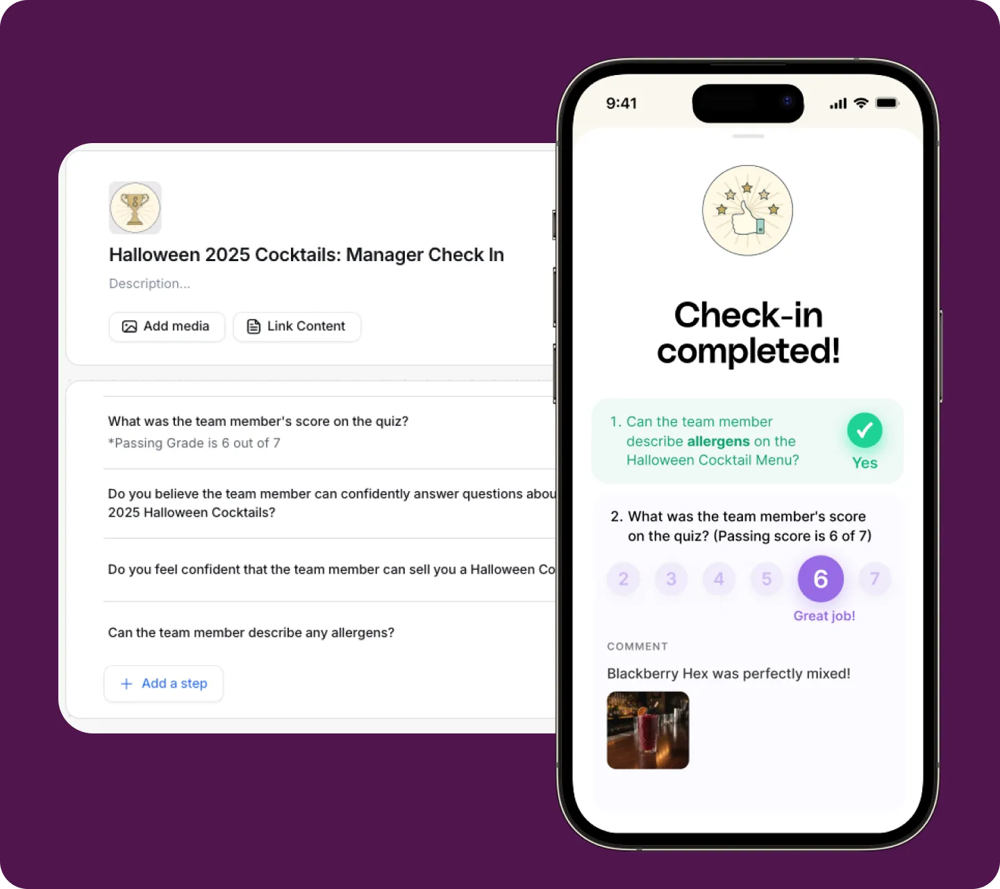 Quality control: Smashburger (200+ locations) keeps quality high and execution consistent with role-based refreshers and check-ins auto-assigned every 30 days.