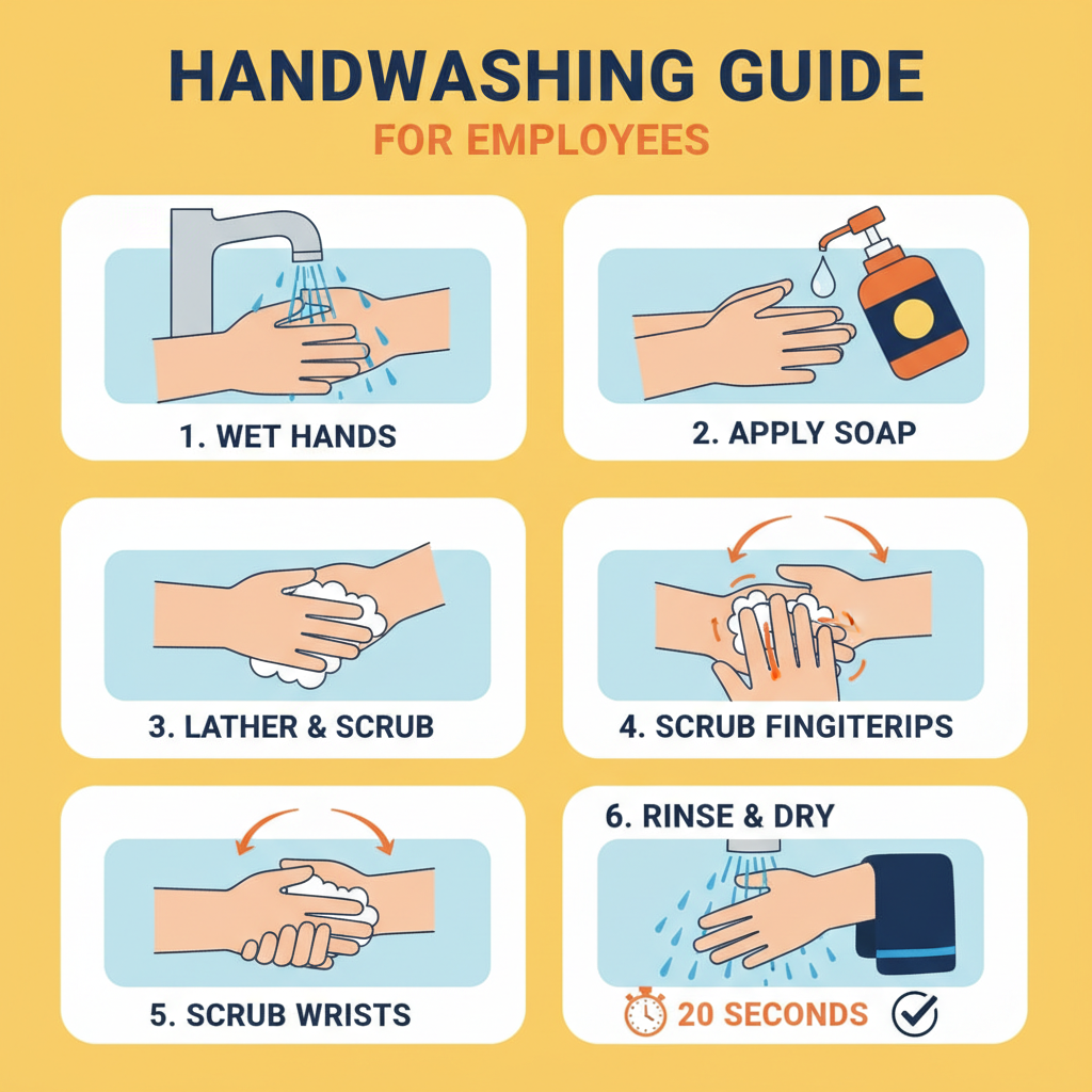 - Prompt to try: "An illustrated step-by-step handwashing guide for our employees. Show hands being washed with soap under running water, scrubbing fingertips and wrists. Use our brand colors, navy and orange, for accents. Clean flat style, clear labels for each step, and a bright, friendly background."