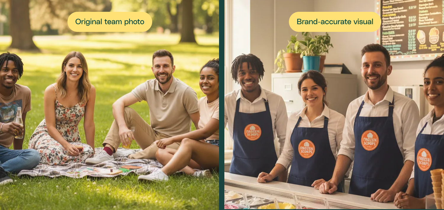 - Prompt to try: "Update this team photo so the staff are wearing our ice cream shop uniforms: navy aprons with orange logos over white button-down shirts. Place them behind the counter of a modern ice cream parlor.