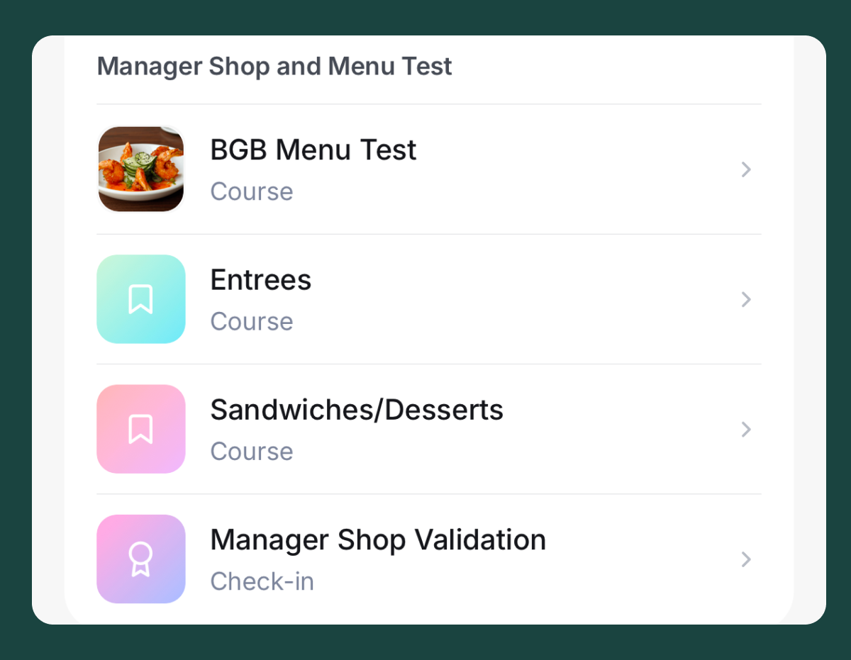 One of the clearest takeaways from the session: short videos outperform long ones, especially for soft skills. Burtons course videos range from 12 second to 1 min. Each video covers one thing—how to greet a table, how to take a drink order—nothing more.