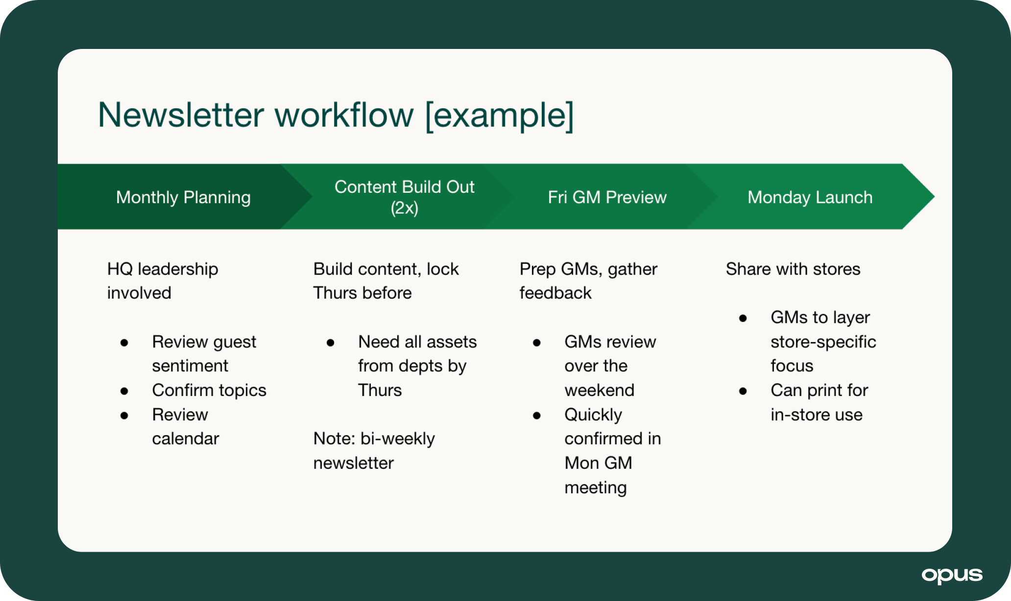 Why This Works: GMs are involved before content goes live. They can confidently share instead of feeling caught off guard. Last-minute updates have room to fit.